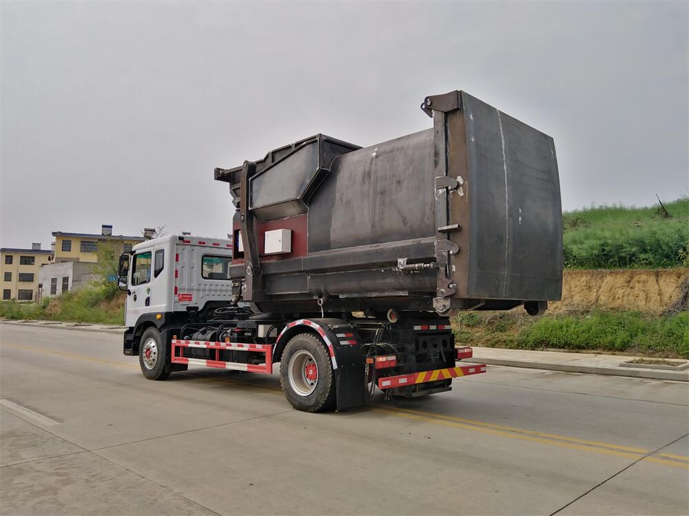 該款鉤臂式垃圾車由液壓系統、操作系統組成。舉升油制缸(1支)系國內知名液壓件廠家生產的雙作用油缸。垃圾廂可自吊上放下,可自行傾倒垃圾,上下一次工作循環時間≤50S。該車的特點是一個車能配多個垃圾廂,能實現一臺車與多個垃圾廂聯合作業,循環運輸,充分提高了車輛的運輸能力。