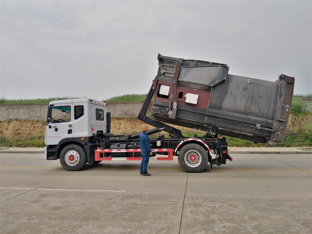 勾臂式垃圾車(車廂可卸式垃圾車)介紹: 車廂可卸式垃圾車又叫拉臂式垃圾車,是一種采用高新設計可伸縮的鉤臂,實現垃圾廂的二次吊裝,自吊上放下,可自行傾倒垃圾的環衛設備。 拉臂式垃圾車結構簡單,操作穩定方便,裝卸效率高,機械化程度高,節省人力。鉤臂垃圾車一車可帶多個垃圾廂,在裝卸的運輸過程中可有效地避免二次污染。 拉臂垃圾車采用高新設計可擺動的鉤臂,垃圾箱由框架、開啟油缸、滑輪、后門和若干加強框架與鋼板焊接而成。調換貨廂快捷方便,貨廂上帶蓋(倒垃圾時可翻開),鉤臂垃圾車垃圾廂體可選用碳鋼、不銹鋼材質、內部采取環氧樹脂防腐處理,改裝部分與原車底盤為可分離式,維修方便且保持了原車的機動性及行駛性能。