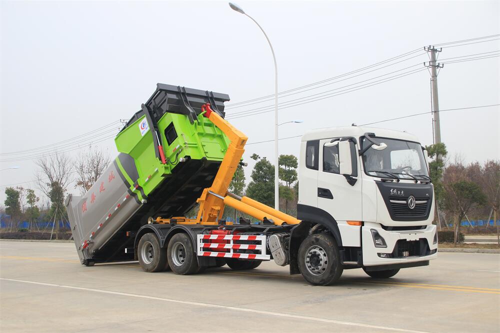 勾臂式垃圾車(車廂可卸式垃圾車)介紹: 車廂可卸式垃圾車又叫拉臂式垃圾車,是一種采用高新設計可伸縮的鉤臂,實現垃圾廂的二次吊裝,自吊上放下,可自行傾倒垃圾的環衛設備。 拉臂式垃圾車結構簡單,操作穩定方便,裝卸效率高,機械化程度高,節省人力。鉤臂垃圾車一車可帶多個垃圾廂,在裝卸的運輸過程中可有效地避免二次污染。 拉臂垃圾車采用高新設計可擺動的鉤臂,垃圾箱由框架、開啟油缸、滑輪、后門和若干加強框架與鋼板焊接而成。調換貨廂快捷方便,貨廂上帶蓋(倒垃圾時可翻開),鉤臂垃圾車垃圾廂體可選用碳鋼、不銹鋼材質、內部采取環氧樹脂防腐處理,改裝部分與原車底盤為可分離式,維修方便且保持了原車的機動性及行駛性能。