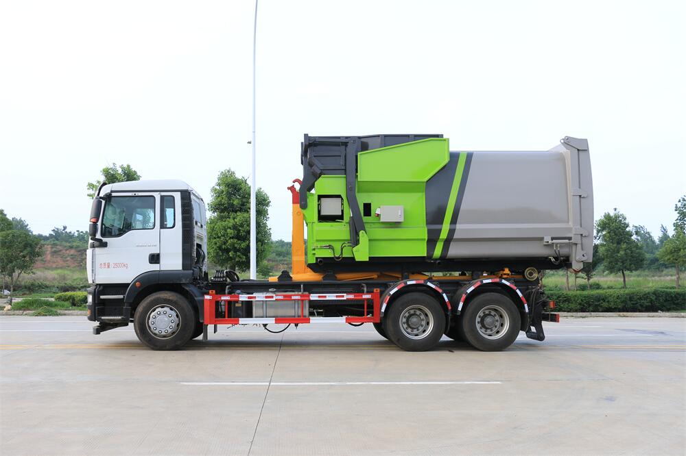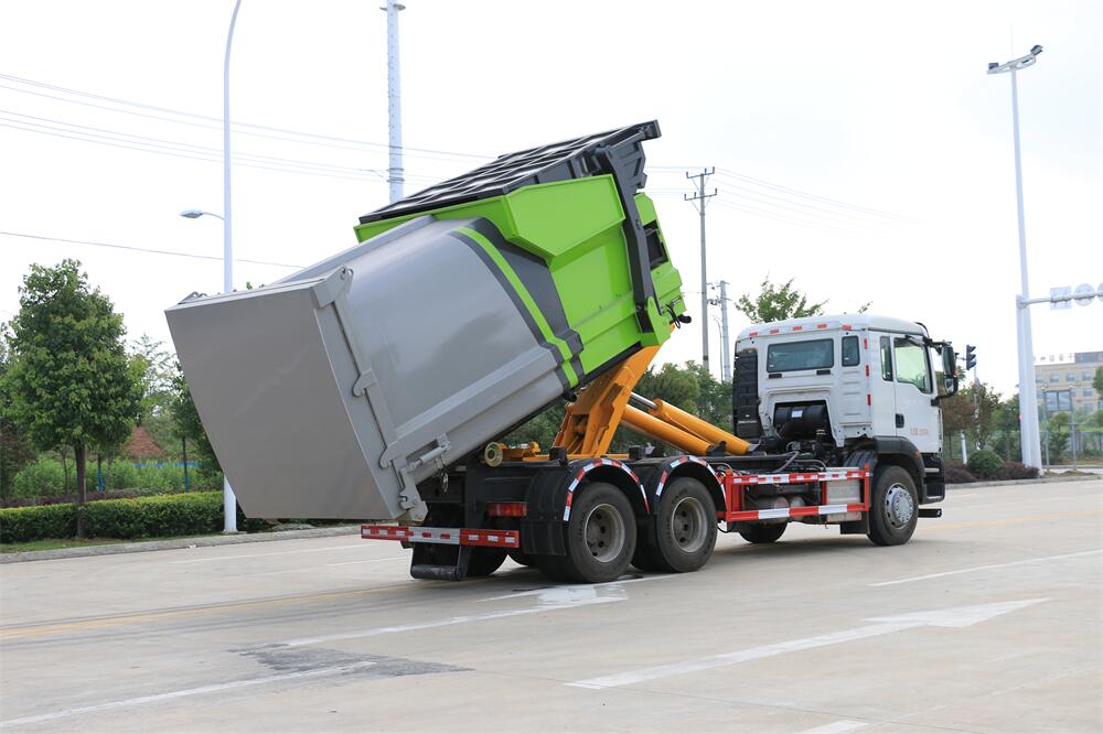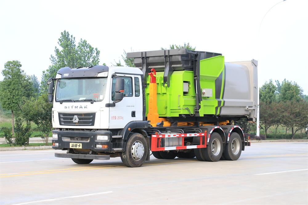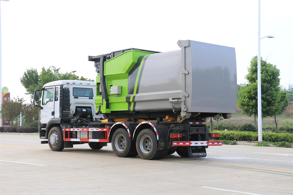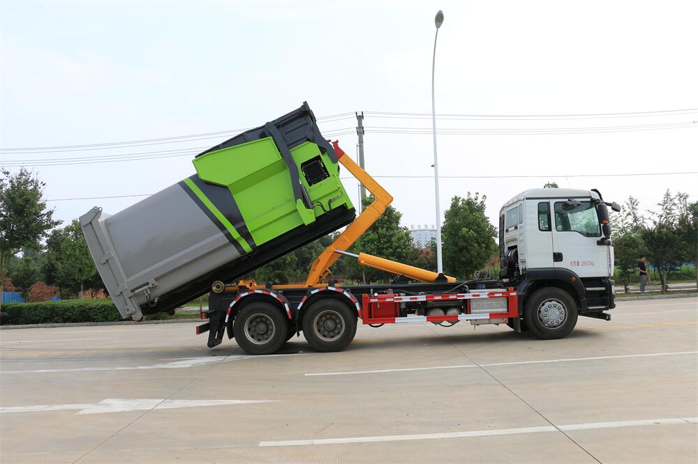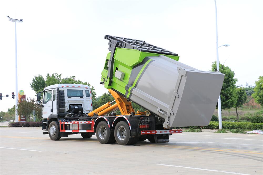 勾臂式垃圾車(車廂可卸式垃圾車)介紹: 車廂可卸式垃圾車又叫拉臂式垃圾車,是一種采用高新設(shè)計可伸縮的鉤臂,實現(xiàn)垃圾廂的二次吊裝,自吊上放下,可自行傾倒垃圾的環(huán)衛(wèi)設(shè)備。 拉臂式垃圾車結(jié)構(gòu)簡單,操作穩(wěn)定方便,裝卸效率高,機械化程度高,節(jié)省人力。鉤臂垃圾車一車可帶多個垃圾廂,在裝卸的運輸過程中可有效地避免二次污染。 拉臂垃圾車采用高新設(shè)計可擺動的鉤臂,垃圾箱由框架、開啟油缸、滑輪、后門和若干加強框架與鋼板焊接而成。調(diào)換貨廂快捷方便,貨廂上帶蓋(倒垃圾時可翻開),鉤臂垃圾車垃圾廂體可選用碳鋼、不銹鋼材質(zhì)、內(nèi)部采取環(huán)氧樹脂防腐處理,改裝部分與原車底盤為可分離式,維修方便且保持了原車的機動性及行駛性能。