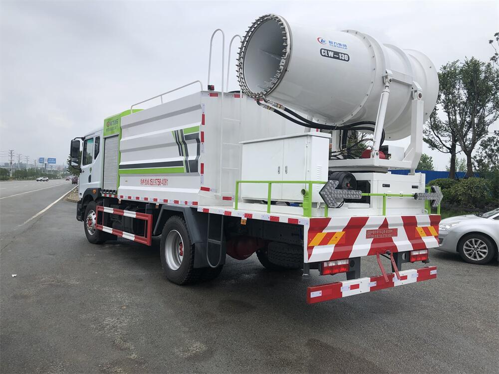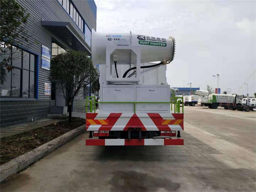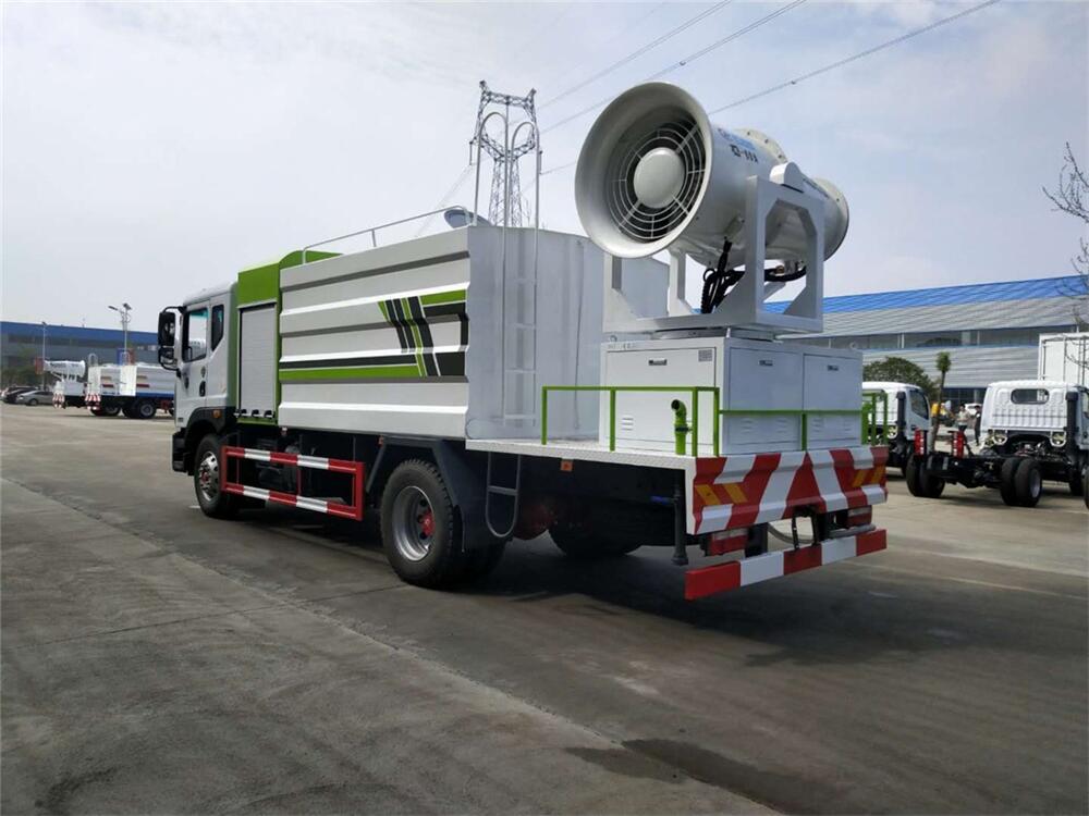 上裝配置:罐體容積為 12立方,選配風送式霧炮機組射程30米、40米、50米、60米、80米、100米、120米霧炮,罐體鋼板為4mm碳鋼Q235材質,罐內隔板具有防波作用,以減輕汽車行駛時罐體液體沖擊,罐體及整車外形尺寸按照公告。帶大功率專用灑水泵,泵可自吸自排,整車前沖、后灑、側噴、帶65消防接口,后平臺配CLW-50、CLW-60、CLW-80、CLW-100、CLW-120型風送式霧炮機組;罐體前封頭配大功率柴油發(fā)電機組;前封頭帶水位計,后平臺主管路帶1寸澆花接口,后爬梯。帶兩根輸水管及陰陽端。罐體顏色:銀/灰/綠,罐體兩側噴“多功能抑塵車”字樣,貼反光標示。