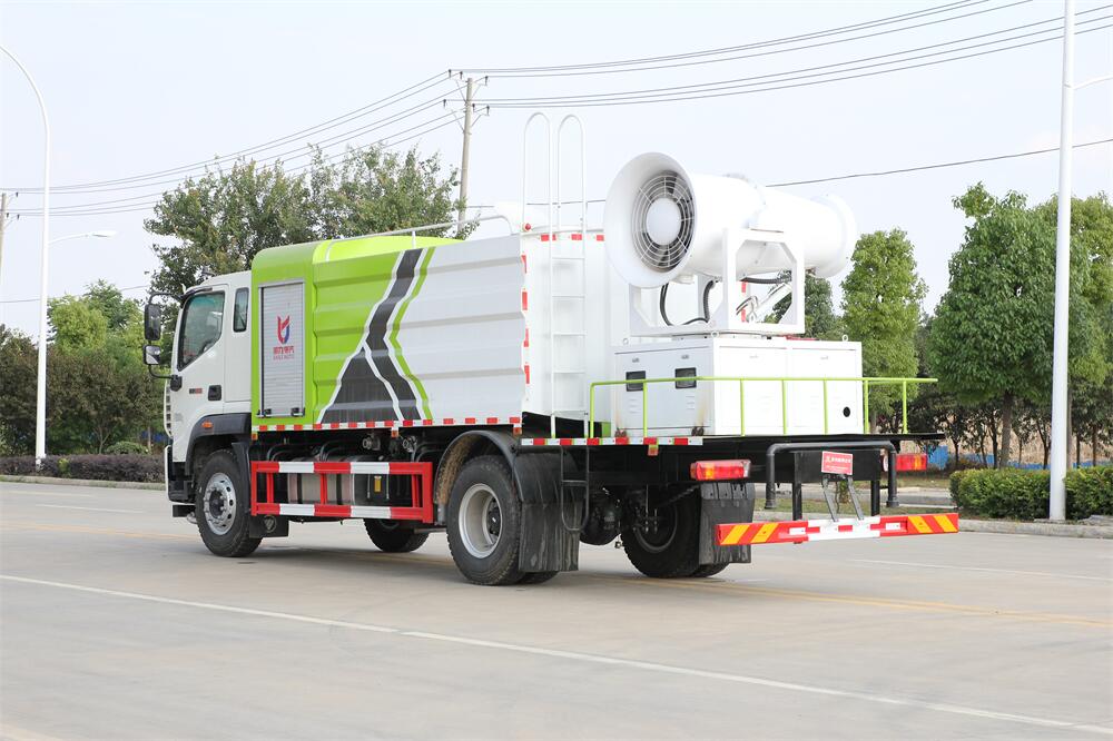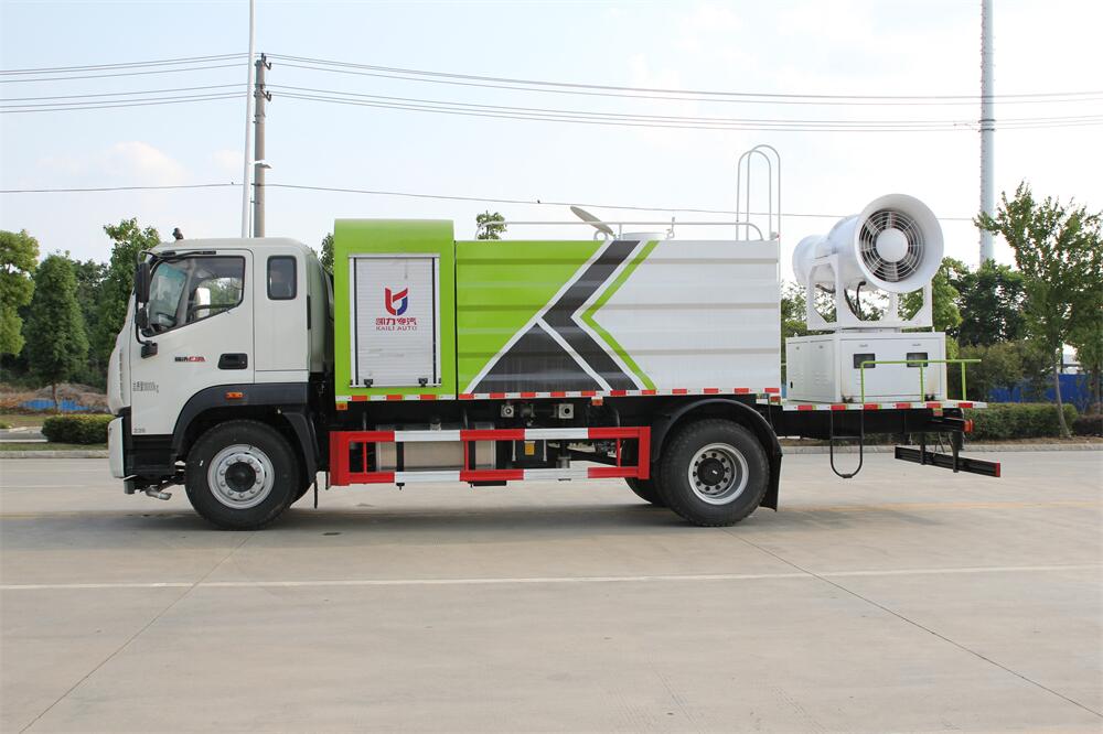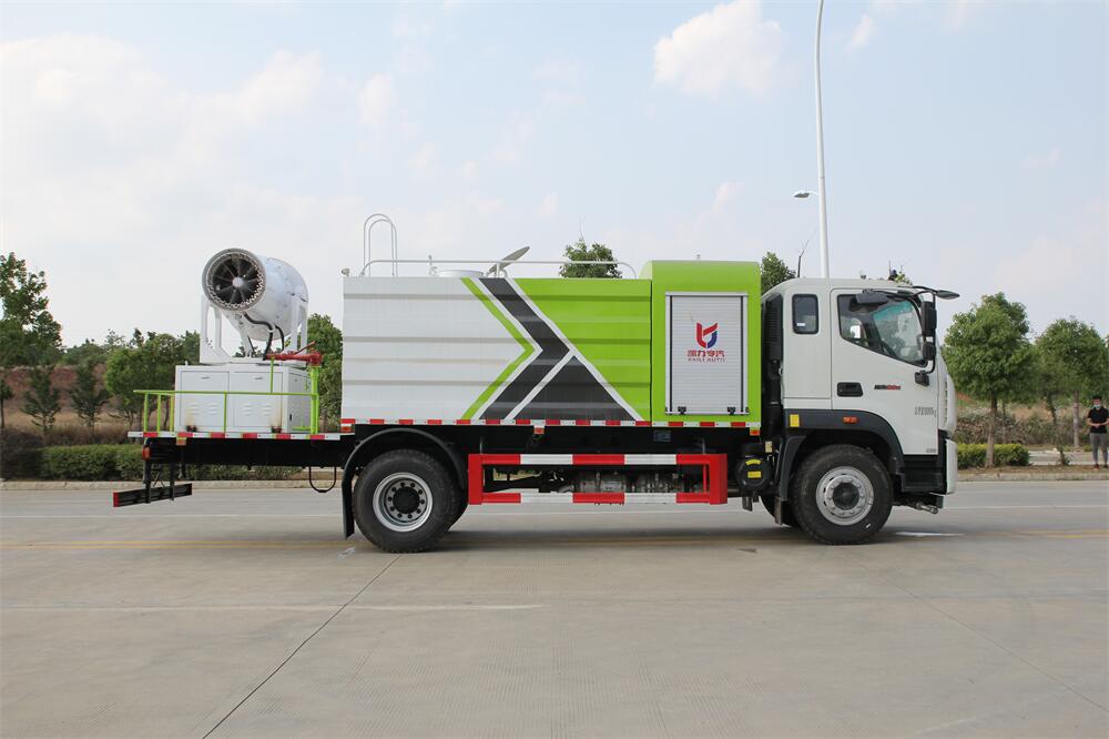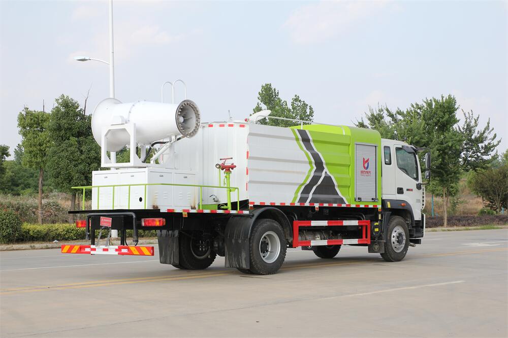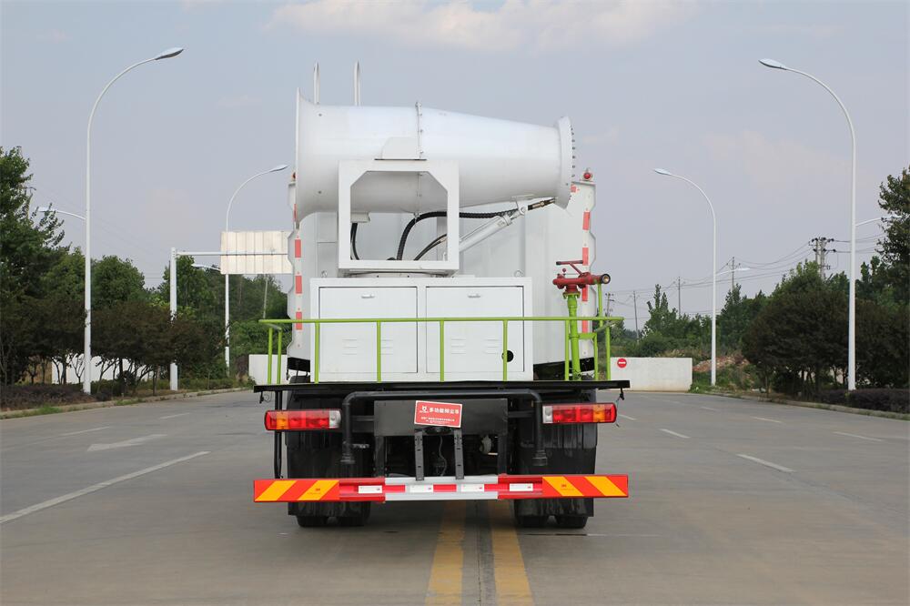 上裝配置:罐體容積為 12立方,選配風送式霧炮機組射程30米、40米、50米、60米、80米、100米、120米霧炮,罐體鋼板為4mm碳鋼Q235材質(zhì),罐內(nèi)隔板具有防波作用,以減輕汽車行駛時罐體液體沖擊,罐體及整車外形尺寸按照公告。帶大功率專用灑水泵,泵可自吸自排,整車前沖、后灑、側噴、帶65消防接口,后平臺配CLW-50、CLW-60、CLW-80、CLW-100、CLW-120型風送式霧炮機組;罐體前封頭配大功率柴油發(fā)電機組;前封頭帶水位計,后平臺主管路帶1寸澆花接口,后爬梯。帶兩根輸水管及陰陽端。罐體顏色:銀/灰/綠,罐體兩側噴“多功能抑塵車”字樣,貼反光標示。