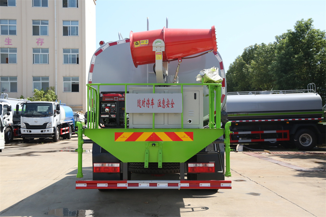上裝配置:罐體容積 12-15立方,風送式霧炮機組30米,40米選擇,罐體采用國標Q235碳鋼材質,罐體厚度4MM,前后封頭5MM加厚型,罐體內雙層隔板具有防波蕩作用,以減輕汽車行駛時罐內液體沖擊;灑水車整車及外形尺寸嚴格按照**機動車公告制作而成;裝配大功率專用灑水泵,前沖、后灑、側噴、后平臺帶綠化灑水炮,灑水炮可全方位旋轉,可連續調成直沖狀、大雨、小雨、毛毛雨;配消防接口,自流閥,濾網,帶自吸自排功能。前封頭帶水位計,后平臺主管路帶1寸澆花接口,后爬梯,帶1個消防接頭,帶1個自流閥,1個過濾裝置,其余標配。