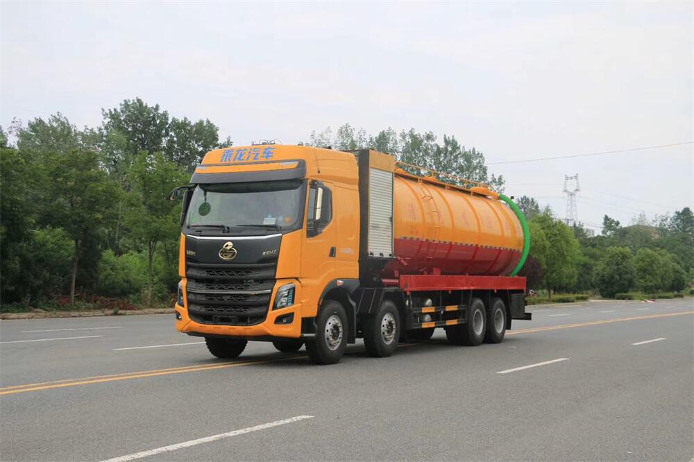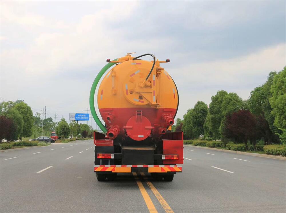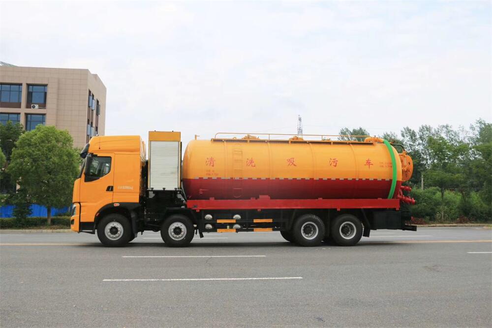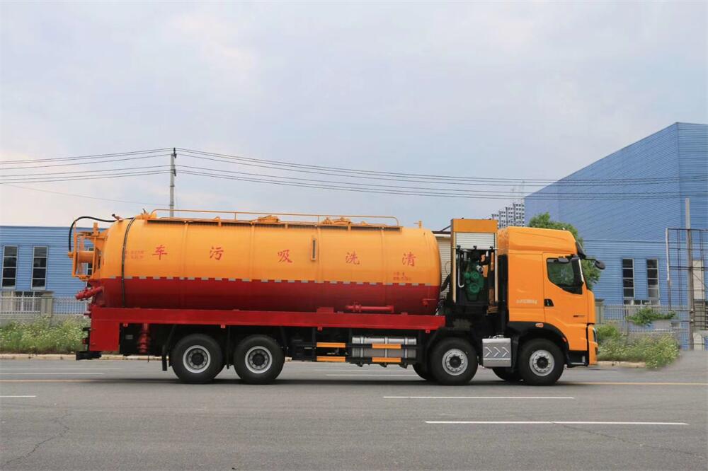 上裝配置:罐體容積為 30 立方(水污可自由 分配),罐體 8mm 厚,封頭 8mm 厚,水罐、污 罐可互通,用 100 球閥**開關(guān);清洗部份采 用雙耀高壓泵,壓力 20Mpa,流量 330L/min, 配 80 米直徑 25 高壓管帶液壓卷盤;吸污部份 采用濰柴420馬力副發(fā)動(dòng)機(jī)帶山東SK-42水循 環(huán)泵(副發(fā)自帶),吸污罐帶舉升,尾部加裝 一個(gè) 600mm 快開,罐體后尾部一個(gè) DN150 不銹 鋼排污口,一個(gè) DN150 不銹鋼偷排,兩個(gè) DN100 吸污球閥帶出口盤,一個(gè)視污窗,兩根 10m 吸 污管,一套陰陽(yáng)端,壓力表,防溢閥,箭頭燈, 工具箱,淋管裝置,高壓泵帶氣吹水。配一個(gè) 9 公斤水雷噴頭,另帶一個(gè) 80 公分手持洗車 噴頭。